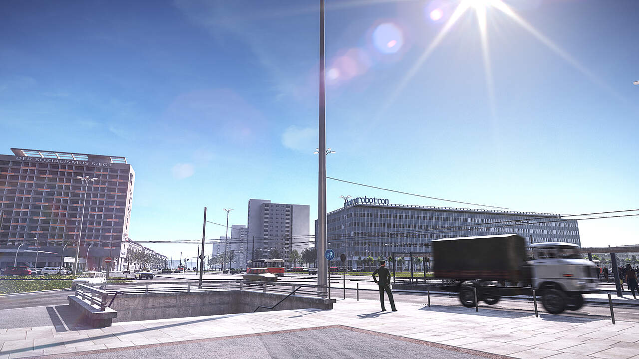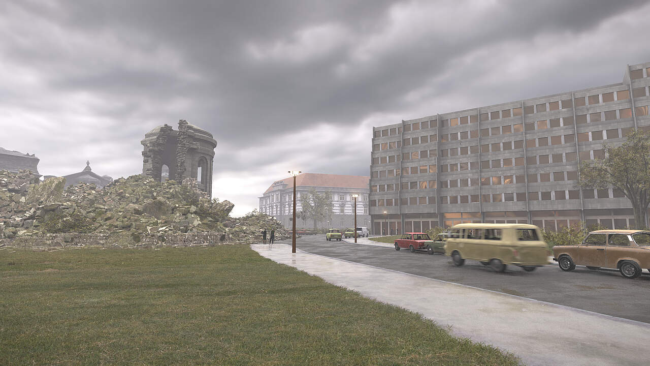 Am Pirnaischen Platz um 1970 hört und sieht man Trabis und Barkas vorbei fahren und erkennt im Hintergrund die letzte verbliebene Ruine des Kurländer Palais, welches erst in den 2000er Jahren wieder aufgebaut wurde.