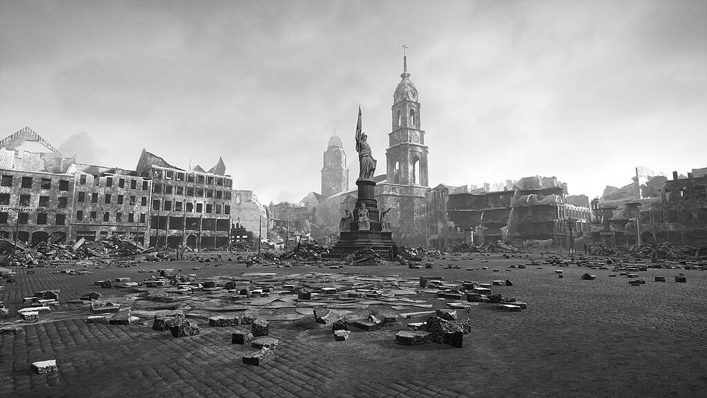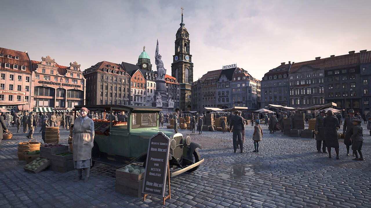 Auf dem Altmarkt in den 1920er Jahren befindet man sich mitten im Markttreiben. Der Blick führt von der Kreuzkirche zum Kaufhaus Renner über das alte Rathaus und das Café Central bis zur Germania. Kurze Augenblicke später befindet man sich an gleicher Stelle, nur im Februar 1945. Die Frauenkirche ist gerade in sich zusammengestürzt und hinterlässt nur noch eine dunkle Rauchwolke. Kein Haus steht mehr.