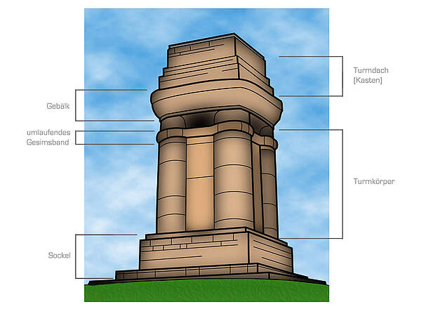 Die 23 m hohe Sandsteinsäule thront auf einem quadratischen Standsockel, welcher auf einer kleinen künstlichen Anhöhe sitzt. Nach einem weiteren übermannshohen und gestuften Turmsockel erhebt sich der hohe Turmkörper. Der Turmkörper, der etwa dreiviertel der Höhe des gesamten Bauwerks einnimmt, spiegelt eine Art überdimensionierten, quadratischen kantonierten Pfeiler wider. Auf der Ostseite des Turmkörpers befindet sich ein Relief eines Adlers, der von zwei Halbsäulen gerahmt wird. Kurz vor dem Abschluss des sich verjüngenden Turmkörpers umläuft ein Gesimsband den Bau. Auf dem Turmkörper sitzt der Turmabschluss. Beginnend mit einer konkaven Gebälkzone, schließt dieser Bereich mit einer dreistufigen Kastenarchitektur, bei der die dritte und überhöhte Stufe die steinerne Grenze der Aussichtsplattform bildet.