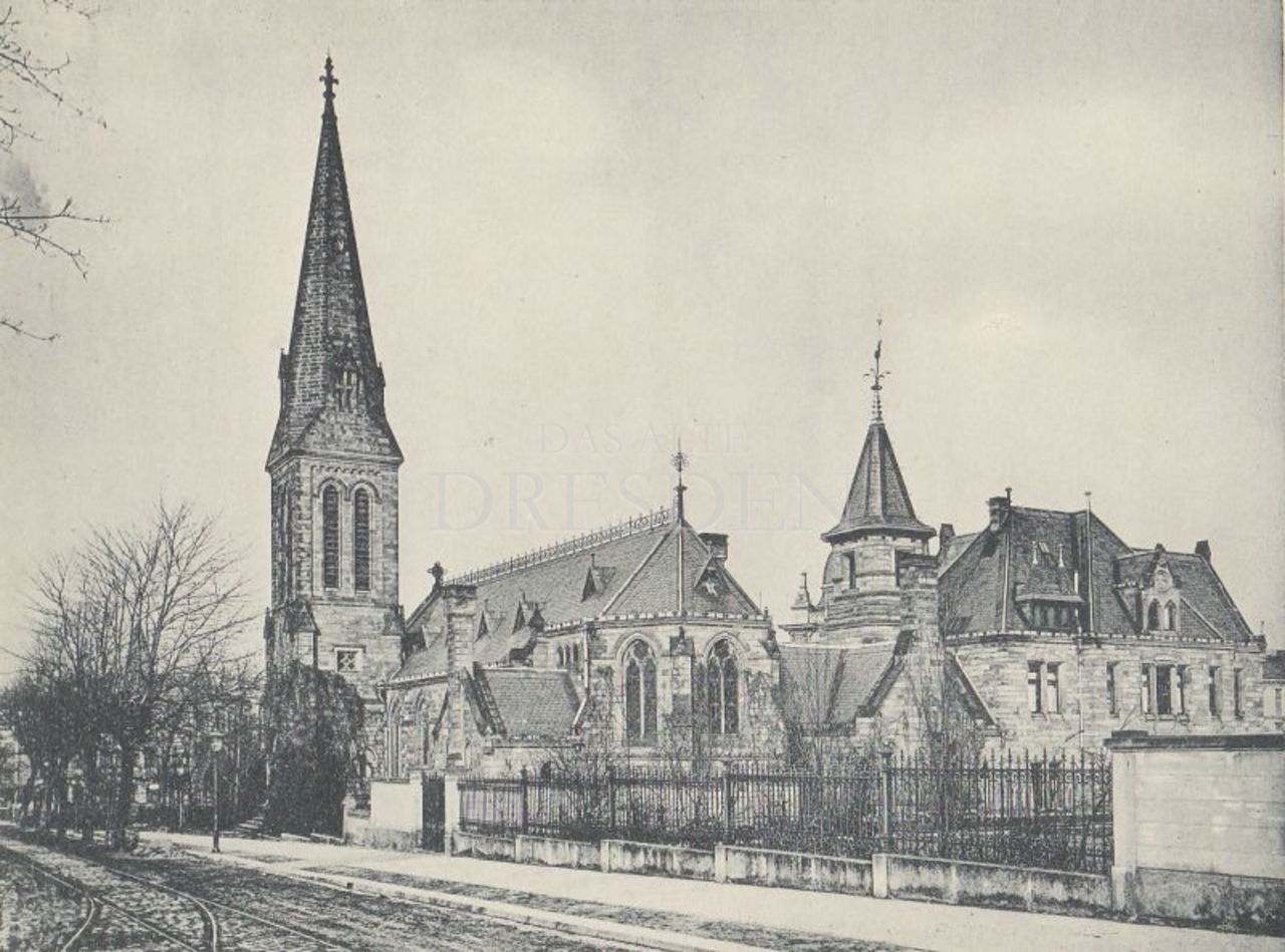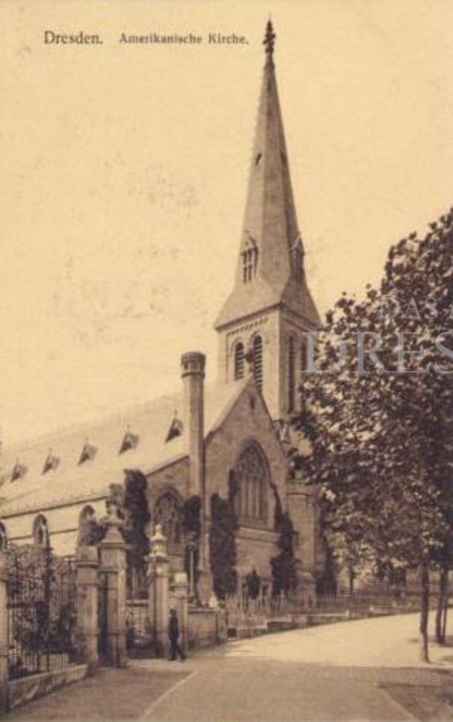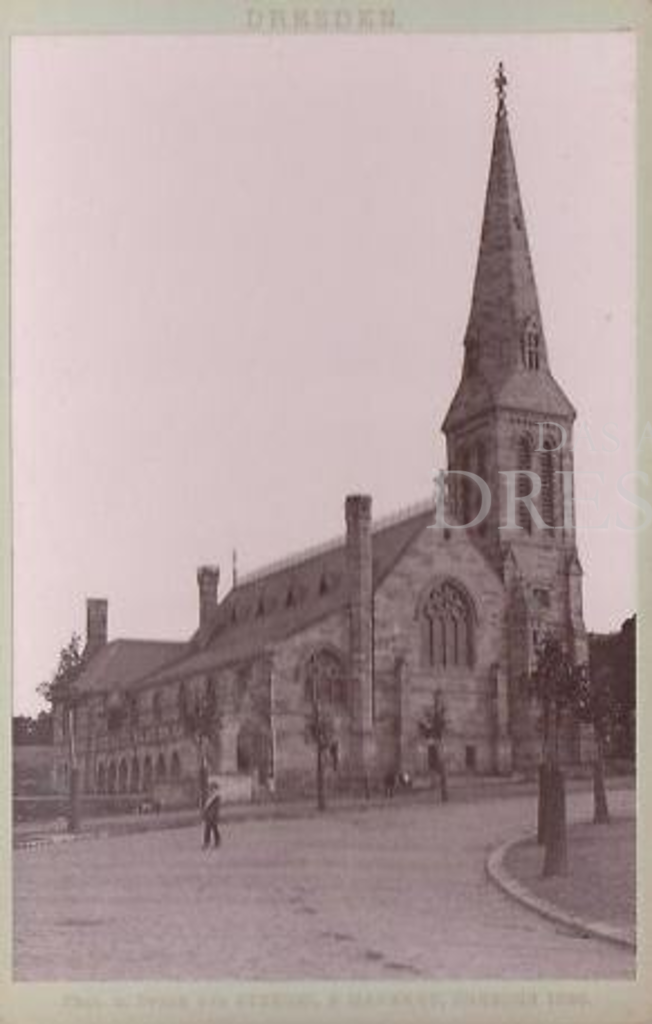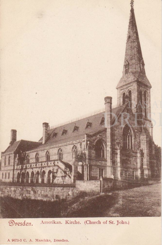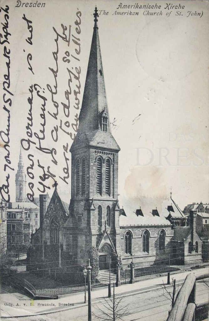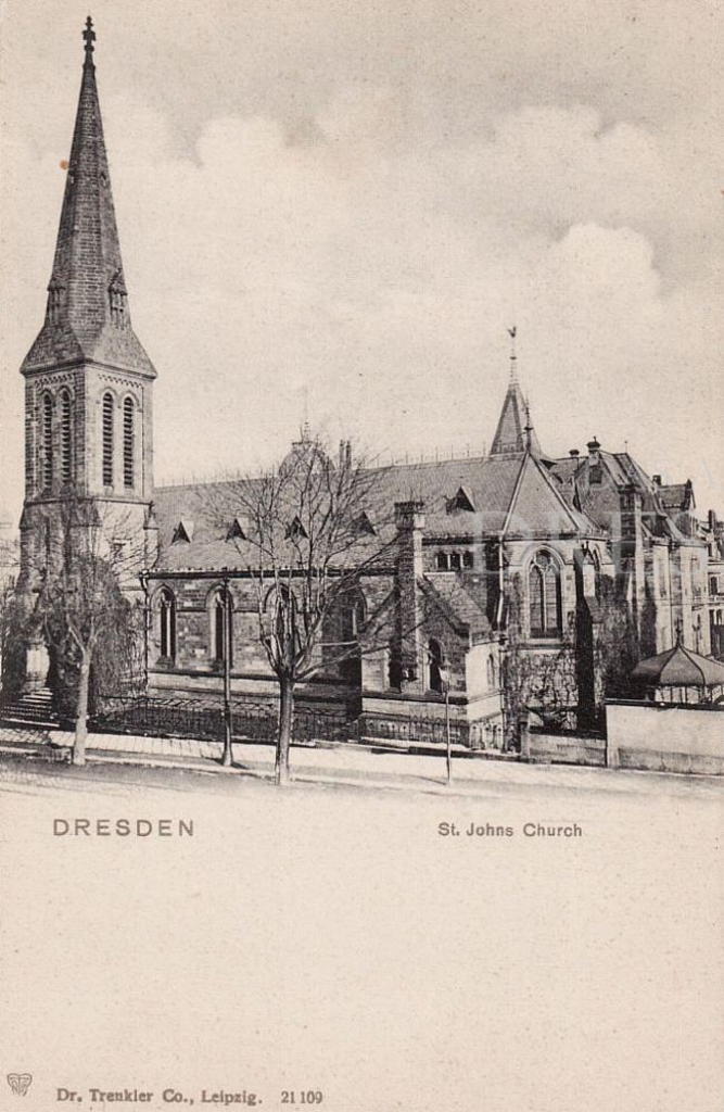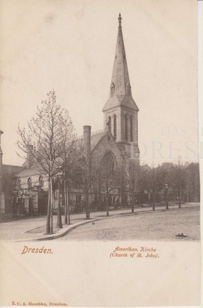 Dreischiffige Hallenkirche, 1883-1884 in neogotischem Stile im Ensemble mit dem Pfarrhaus von Architekt Dögel errichtet, Standort südlich des Hauptbahnhofes, Bau durch eine Stiftung der Amerikanerin Mrs. Thompson ermöglicht, "American Church of St. John" genannt, im Jahre 1900 ca. 200 Mitglieder, 1945 bei den Bombardements ausgebrannt, Turm völlig intakt