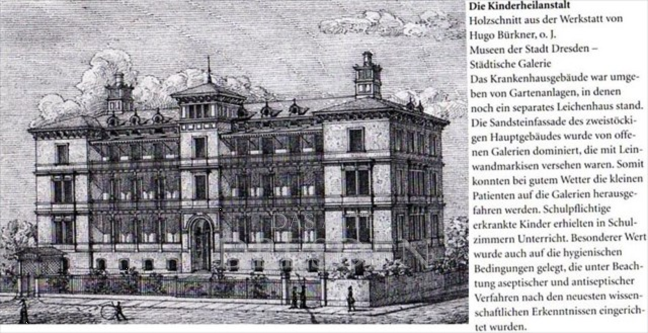 1878 durch den Dresdner Pädiater Richard Clemens Förster errichtet (Kapazität 66 Betten, Patientenzahl pro Jahr etwa 1000)