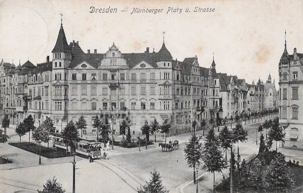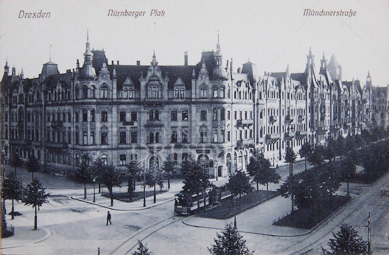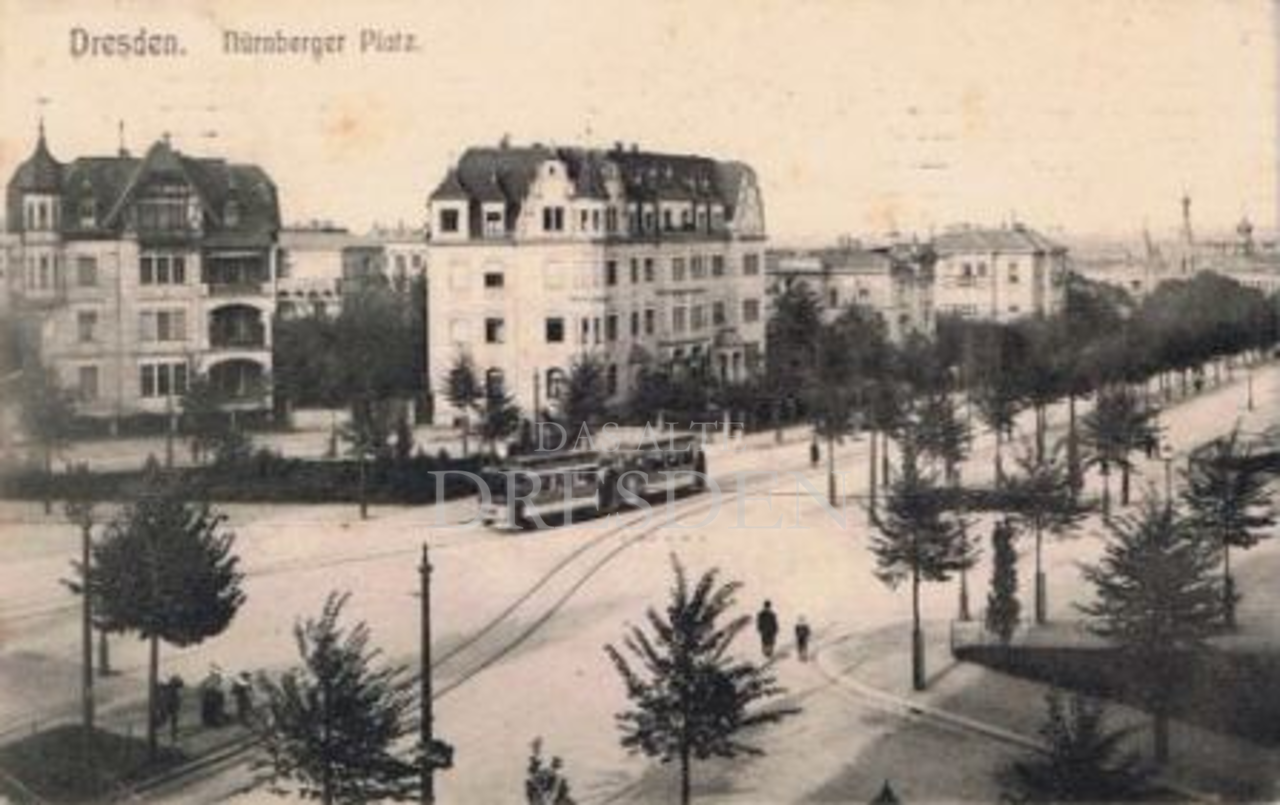 Der Nürnberger Platz wurde 1899 als Zentrum eines neuen Stadtviertels angelegt und in Reverenz an die fränkische Metropole Nürnberg benannt. Um den kreisförmigen Platz entstanden repräsentative Wohn- und Geschäftshäuser, welche oft Jugendstilformen aufwiesen. Hier trafen auch die Straßenbahnlinien nach Plauen (Münchner Platz) und zum “Nürnberger Ei” aufeinander. Im Haus Nr. 5 hatte ab 1927 der Verein jüdischer Studenten in Dresden seinen Sitz.