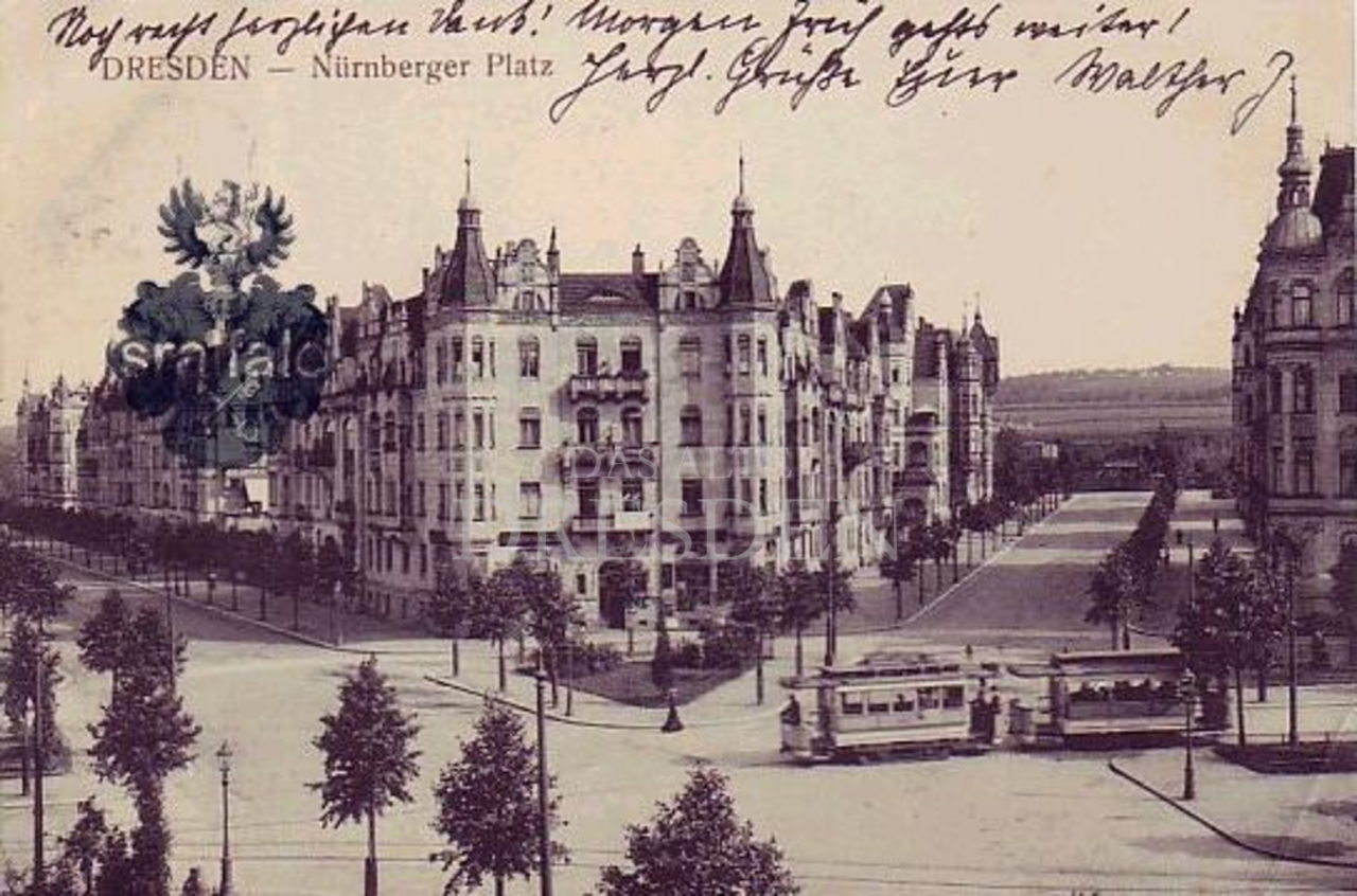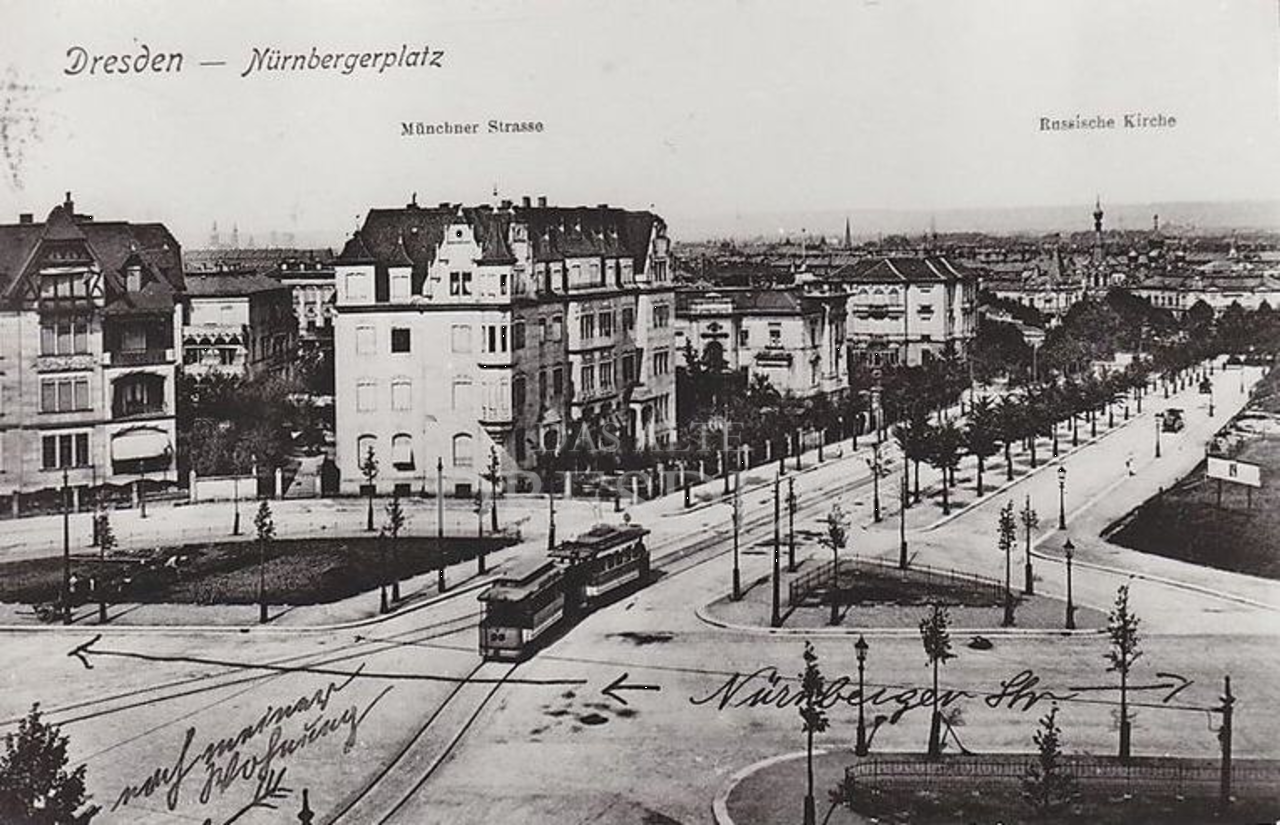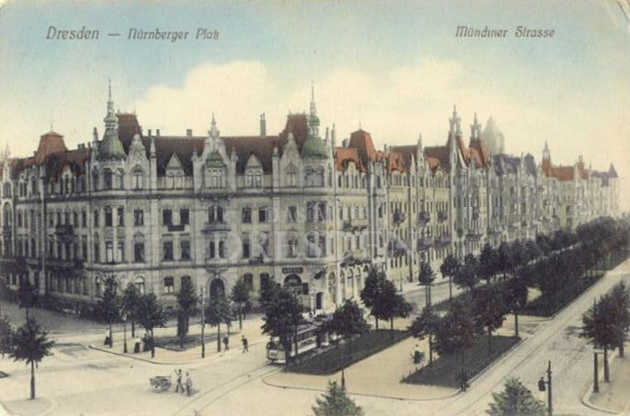 Der Nürnberger Platz wurde 1899 als Zentrum eines neuen Stadtviertels angelegt und in Reverenz an die fränkische Metropole Nürnberg benannt. Um den kreisförmigen Platz entstanden repräsentative Wohn- und Geschäftshäuser, welche oft Jugendstilformen aufwiesen. Hier trafen auch die Straßenbahnlinien nach Plauen (Münchner Platz) und zum “Nürnberger Ei” aufeinander. Im Haus Nr. 5 hatte ab 1927 der Verein jüdischer Studenten in Dresden seinen Sitz.