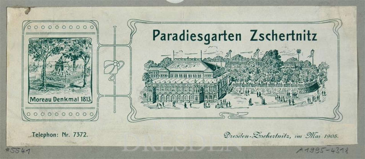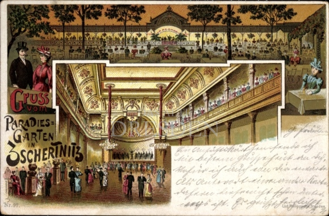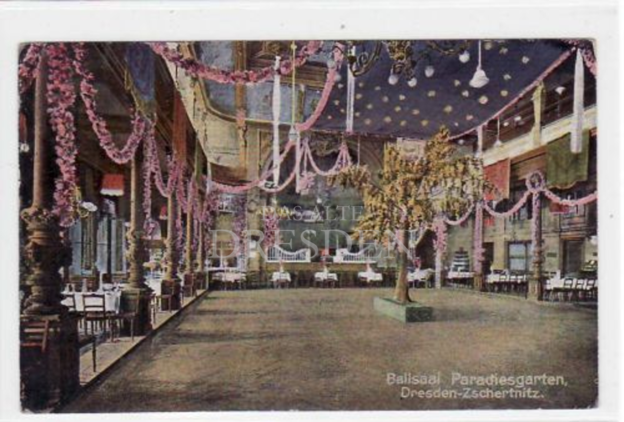 Der Paradiesgarten im Dresdner Süden entstand ursprünglich aus dem Dorfgasthof Zschertnitz, welcher 1886 vom Schankwirt Heide komplett umgebaut und zum Ballhaus erweitert wurde. Schnell wurde der Paradiesgarten ein beliebtes Ausflugsziel für Jung und Alt und avancierte sogar zu einem der fünf bedeutendsten Dresdner Ballhäuser.