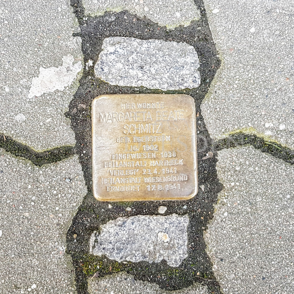 Margareta Beate Schmits, geb. Egerström, wurde am 1.4.1902 in Schweden geboren. Sie war Kunststudentin in Dresden und lebte nach ihrer Heirat in Berlin und nach Scheidung 1934 mit ihrer Tochter Ingrid in Dresden. Als „Geisteskranke“ wurde sie 1938 in verschiedene Nervenkliniken eingeliefert, wo ihre Zwangssterilisation veranlasst wurde, wie es das 1933 von den Nationalsozialisten erlassene „Gesetz zur Verhütung erbkranken Nachwuchses“ vorschrieb. Am 23. April 1941 wurde sie in die Heil- und Pflegeanstalt Wiesengrund, dem heutigen tschechischen Dobrany, überführt, wo sie im Alter von 39 Jahren ums Leben kam. Im Totenregister wurde als Todesursache vermerkt: an "Lungenentzündung" einer der üblichen offiziellen NS-Euphemismen für "ermordet".