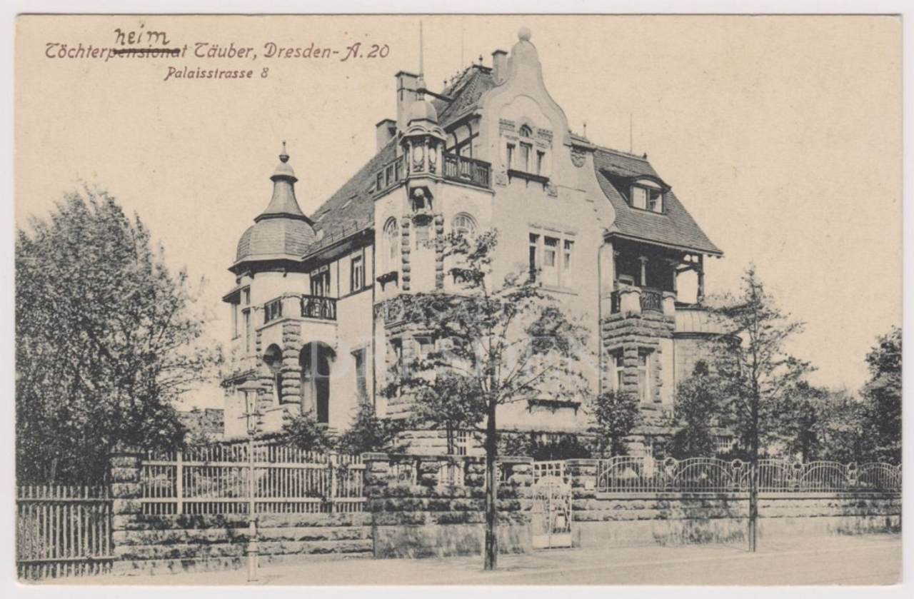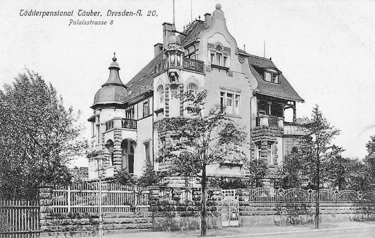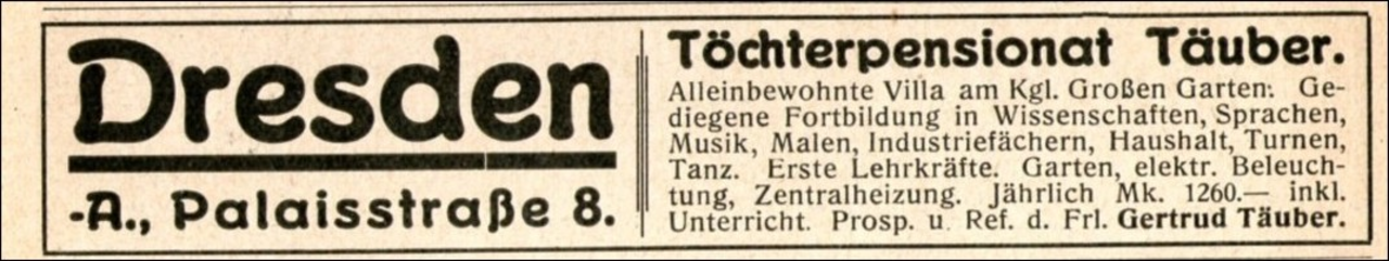 "Alleinbewohnte Villa am Kgl. Großen Garten: Gediegene Fortbildung in Wissenschaften, Sprachen, Musik, Malen, Industriefächern, Haushalt, Turnen, Tanz. Erste Lehrkräfte. Garten, elektr. Beleuchtung, Zentralheizung. Jährlich Mk. 1260,- inkl. Unterricht. Prosp. u. Ref. d. Frl. Getrud Täuber."
