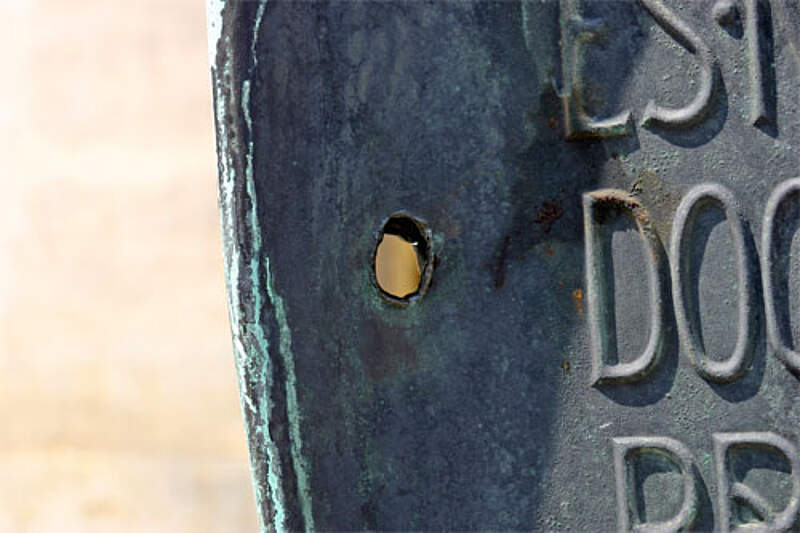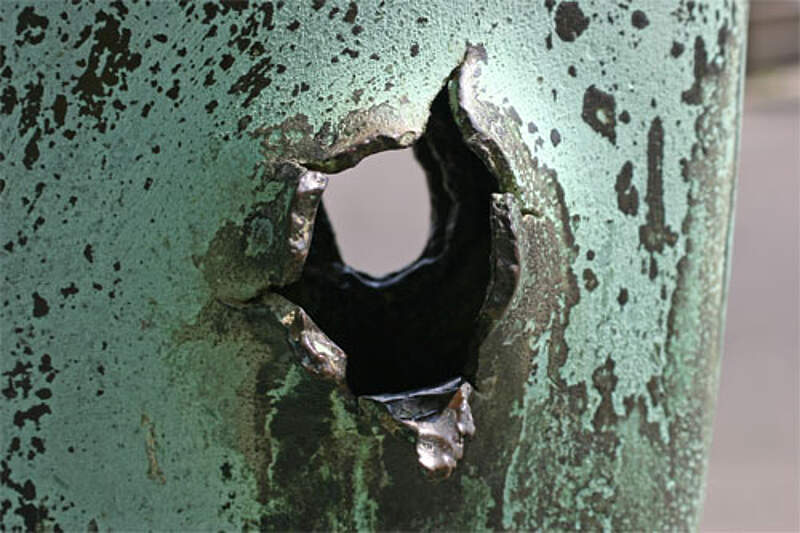 Deutlich zu erkennen ist noch heute der Durchschlag eines Bombensplitters auf dem Linken der Schilde.